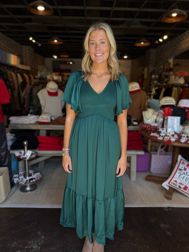 V-neck washed satin smocked body flutter sleeve midi dress with full lining.
