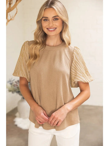 Tan Zebra Pattern Puff Sleeve Knit Top
