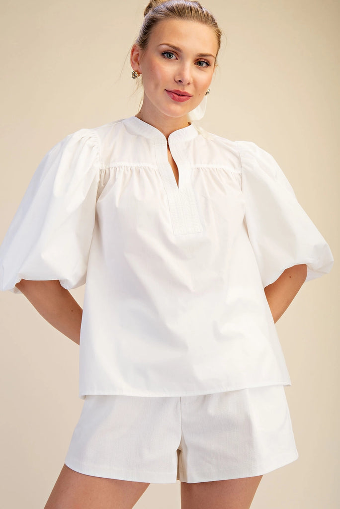 Elevate your everyday style with this charming poplin top that's anything but ordinary. The crisp china collar frames your face beautifully, while the flattering V-neckline adds a touch of sophistication. Those delightful bubble sleeves? Pure fun and movement. Crafted from quality poplin fabric, it's the perfect piece to dress up with tailored trousers or keep casual with your favorite jeans. A wardrobe essential that brings personality and polish to any occasion.