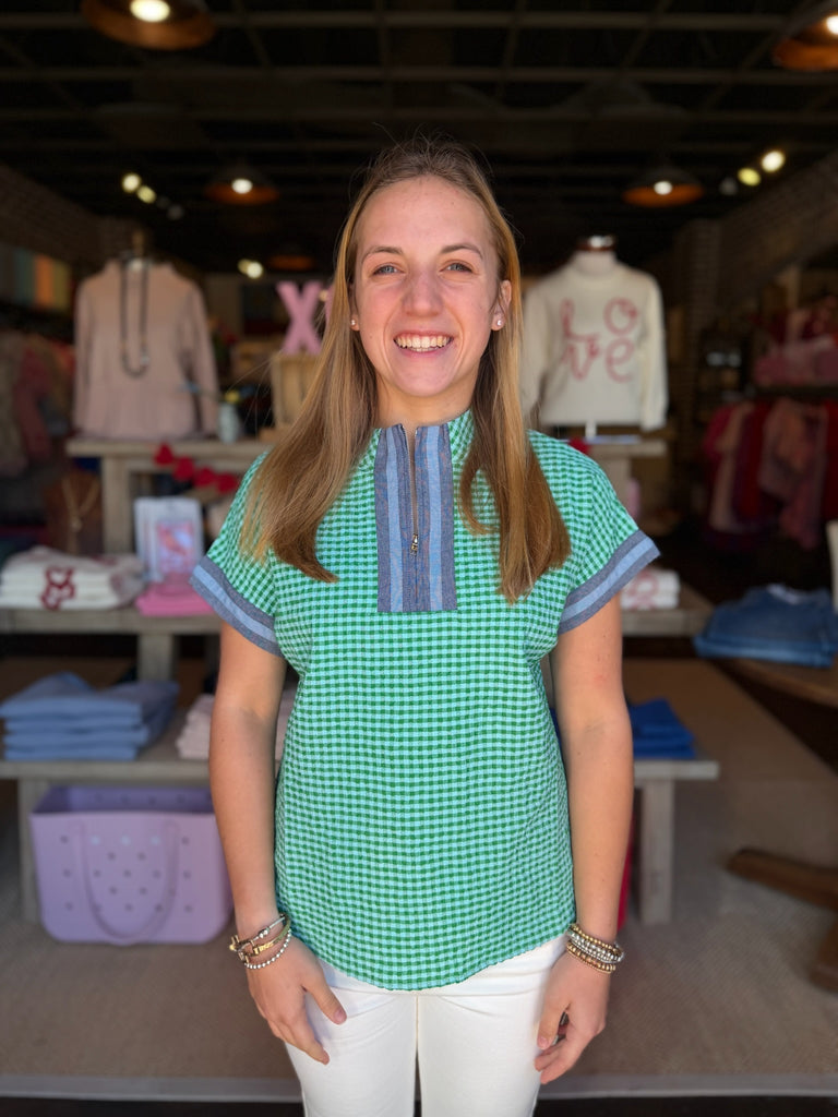 Crisp, cheerful, and oh-so-easy to style—this green gingham top is your new warm-weather essential. The classic checked pattern brings timeless charm, while the short sleeves keep things breezy and comfortable. Perfect for casual outings, weekend adventures, or dressing up with your favorite bottoms. A versatile piece that works as hard as you do, from morning coffee runs to evening hangouts. Simple, stylish, and ready for anything.