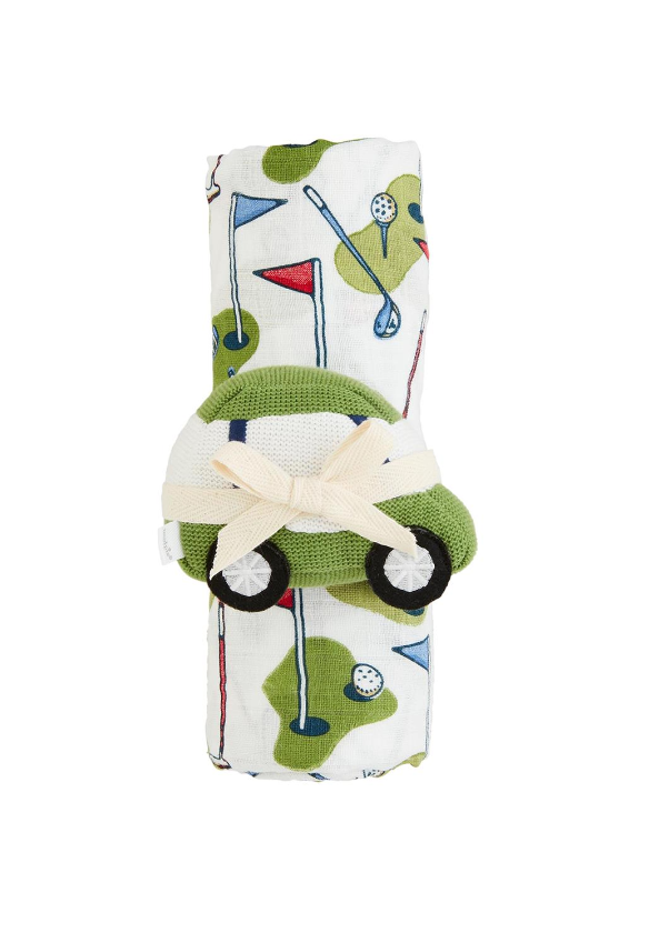 2-piece set. Muslin swaddle blanket. Comes with sweater knit rattle
