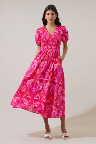 Prissa Ikat Brenty Smocked Midi Dress Magenta