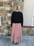 Bring a burst of fun to your wardrobe with this Red Striped Floral Midi Skirt. Its vibrant paisley and floral pattern dances across the fabric, while the midi length offers a flirty, twirling fit. Perfect for sunny days or playful evenings, this skirt adds a splash of color and charm to any outfit.