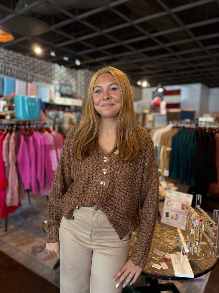 This sweater features a henley neckline, dropped shoulders, exaggerated buttons, and side slit details. The henley neckline adds elegance, while the dropped shoulders create a casual look.