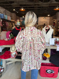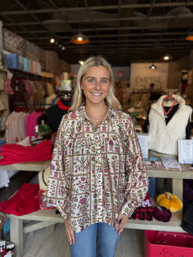 The Mauve Rae Top offers a charming blend of elegance and vibrancy with its button-up design and delicate pink and green floral pattern. Its long sleeves provide a graceful silhouette, making it perfect for both casual outings and dressed-up occasions. Experience comfort and style in one versatile piece that brightens your wardrobe effortlessly.