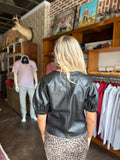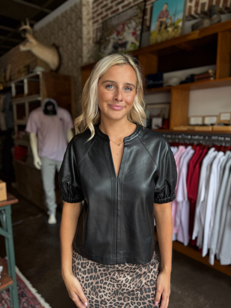 Elevate your wardrobe with the Roxanne Top—a chic black leather piece designed to deliver sleek sophistication. Its smooth leather finish adds an edgy yet refined touch, perfect for making a bold statement day or night. Experience confident style and timeless appeal with this versatile top that pairs effortlessly with anything from tailored pants to your favorite jeans.