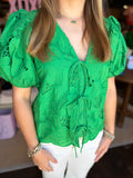 Breezy and adorable, this Kelly Green eyelet top is your new warm-weather essential. The charming tie front and puff sleeves deliver instant cuteness, while the scallop edge trim adds a playful finishing touch. Perfect for effortless, feel-good style when the sun's shining.