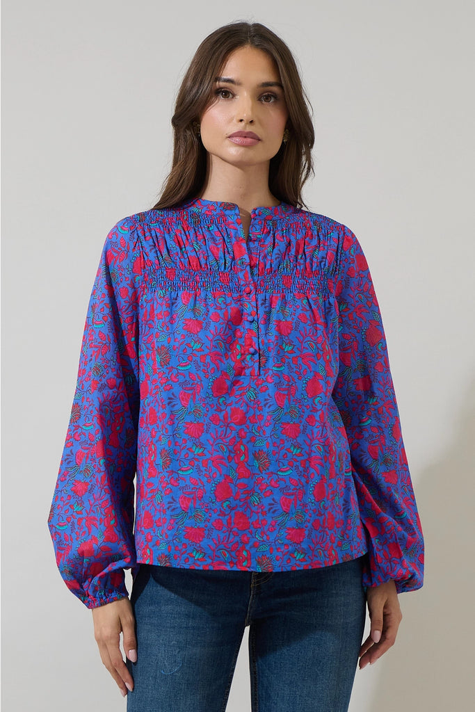 Looking for the perfect blend of fun and elegance? This floral top delivers! It features long balloon sleeves, a smocked chest, and a functional half button up design, all complemented by a beautiful floral print. Pair it with high waisted jeans and ankle boots for a chic, casual vibe.