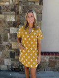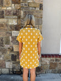 RESTOCK ALERT! Perfect fall dress in this mustard color. Fun detail and leather trim collar!