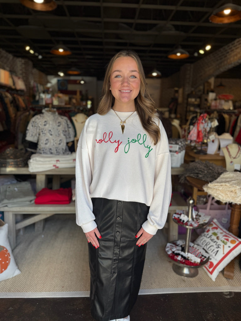 Spread holiday cheer in this cozy knit long-sleeve top featuring playful script lettering that spells out "Holly Jolly." Perfect for festive gatherings, casual holiday parties, or anyone ready to embrace the season's joyful spirit. The soft, cloudy knit fabric keeps you comfortable while the cheerful message makes a fun statement. Whether you're decorating, caroling, or simply celebrating, this top brings warmth and whimsy to your winter wardrobe.