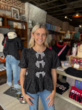 Elevate your look with the Arielle Jacquard Mania Bow Top, featuring a textured black fabric that adds depth and sophistication. The standout silver sequined bow details bring a touch of sparkle, making it perfect for both daytime elegance and evening flair. This top effortlessly combines subtle texture with eye-catching accents to help you shine in any setting.