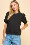 A knit top featuring a crew neckline, short puff sleeves with gathered shoulders, and ribbed cuffs and hem for a polished fit.