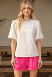 Elevate your wardrobe with this cream tweed-inspired blouse that effortlessly blends sophistication with versatility. Pearl-embellished trim adorns the neckline, adding a refined touch, while romantic bubble sleeves create a flattering, feminine silhouette. The structured woven fabric maintains its pristine shape throughout the day, making it ideal for pairing with denim, skirts, or layering under blazers. Whether you're commanding the boardroom or enjoying weekend brunch, this timeless piece transitions beautifully from professional polish to casual elegance—a true closet essential that works as hard as you do.