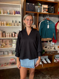 The Jocelyn Top is a refined piece that pairs effortlessly with any outfit. The subtle textured fabric adds a sophisticated touch, while the pop collar v-neckline keeps things fresh and modern. With 3/4 sleeves featuring stylish slits at the cuffs, this top allows you to express your unique style.