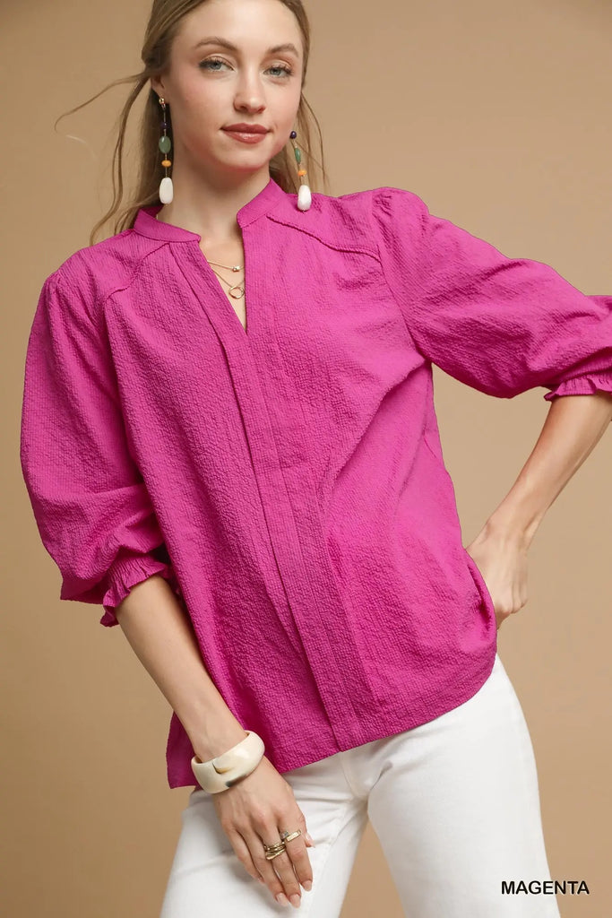 The Sarah Top is your new go-to for effortless style! This beauty features a textured woven fabric that adds visual interest and dimension to any outfit. The flattering V-neckline pairs perfectly with the relaxed, flowy silhouette that moves with you throughout the day. Sharp piping detail gives it a polished edge, while the unlined construction keeps things breezy and comfortable. Dress it up or down—this versatile piece is ready for whatever adventure comes your way!