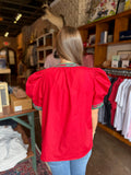 Elevate your casual wardrobe with the Heather Top, featuring vibrant red fabric complemented by classic buffalo plaid detailing on the sleeves. This short sleeve design offers comfortable breathability while adding a touch of timeless pattern contrast. Perfect for layering or wearing solo, it effortlessly blends bold style with everyday versatility, making it a standout piece for any season.