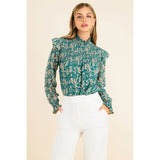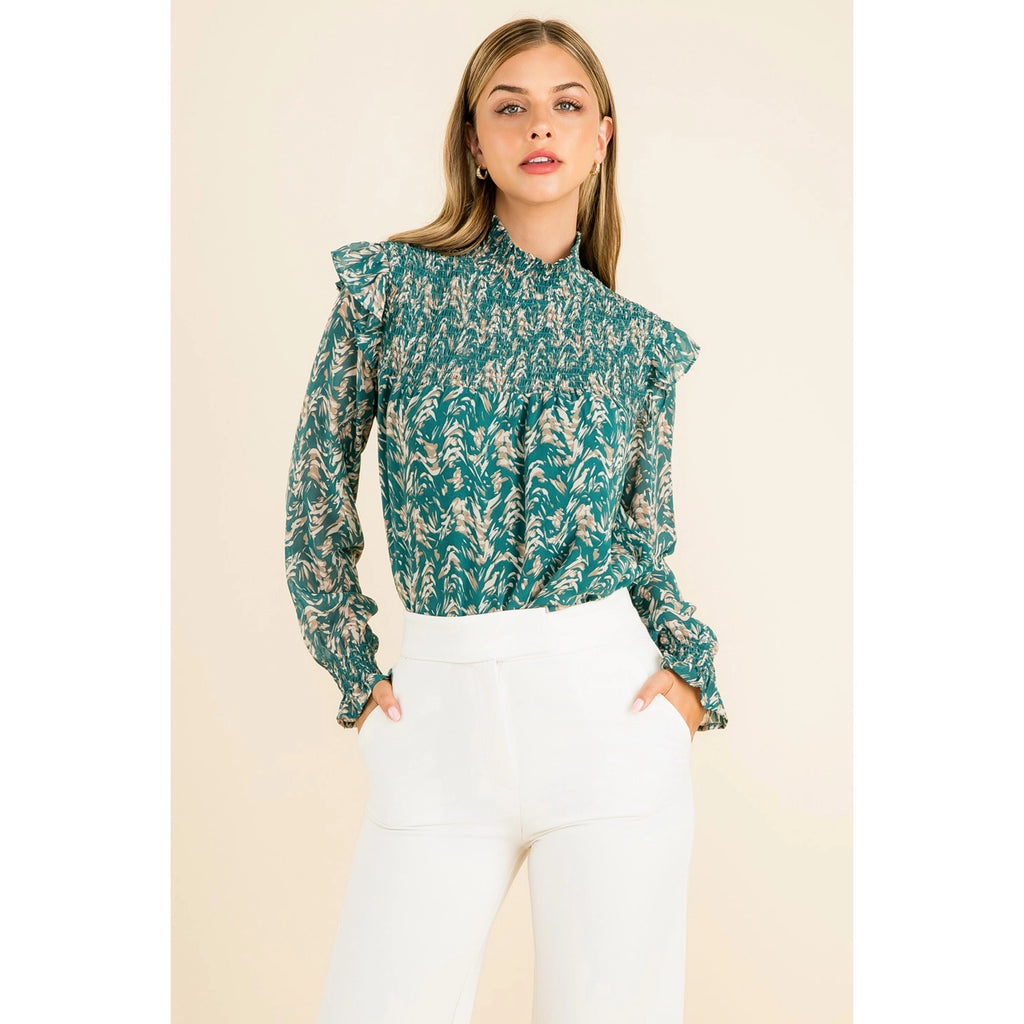 Teal Smocked Print Blouse