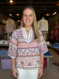 Elevate your everyday style with this charming &merci exclusive V-neck top, featuring a playful bubble sleeve design that adds instant personality. The contrast ruffled neckline and elbow-length sleeves with coordinating cuffs create a polished yet relaxed silhouette perfect for effortless dressing. Crafted with a comfortable relaxed fit and lined for smooth wear, this sand multi print piece transitions seamlessly from casual outings to weekend adventures. A wardrobe essential that brings both comfort and flair to your collection.